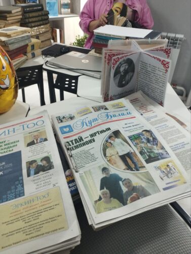 — Президент Садыр Жапаровдун жарлыгына ылайык, анын демилгеси менен кыргыз тилинде басылып чыккан көптөгөн китептер бизге дагы жетти. Демөөрчүлөр дагы окурмандар талап кылган адабияттарды камсыз кылууга жардамдарды берип жатат. Жаңы маалыматтык технологиялар менен иш жүргүзүүгө толук мүмкүнчүлүктөр болуп калды. Улуу, ортоңку жана кичи муундар деп кадр маселеси дагы жакшы жолго коюлган. Эриш-аркак болуп ааламдашуу жолунда маалыматтык тейлөөнү уюштурууга, аны алга жылдырууга дагы бизде толук мүмкүнчүлүктөр, шарттар бар, — дейт Дамира айым. — Бая күнү балдар акыны Ысмайыл Кадыров келип, сааттын жебесин көрүп (анда атбашылык төбөсү көрүнгөн инсандардын сүрөт илинген), абдан сүйүндү. Китепканабыз Салымбеков университети тарабынан компьютерлер менен камсыз кылынган.