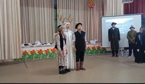 Сахнанын башынан Бугу-Эне жай басып балдарды жетелеп кирип барат:
