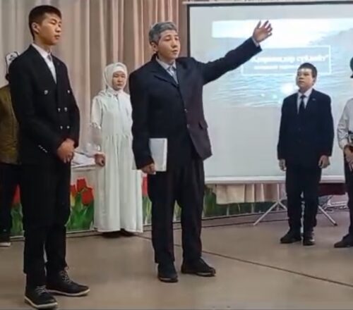 - Эээй ээ эээй турналар,турналар! Балдар, карагылачы, турналар, турналар эрте келишиптир, заман оңолот! Жаңы мектептер салынат, билим берүү өзгөрөт. Өлкөбүз өнүгөт. Карагылачы, конгону бара жатышат, турналар, турналар канатыңдан таштай кет. Бул турналар, бул бийикке учкан канаттар. Биз да ушундай болууга тийишпиз! Биздин канаттарыбыз билимде, биздин жолубуз ушундай бийиктикке жетет. Билим бизди алыска алып барат!