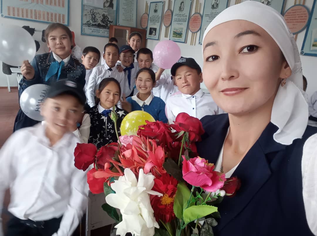 Мугалим: — Саламатсыңарбы, балдар? Азаматсыңар! Жалпыңарга күн нурундай жылуулукту, гүлдөй сулуулукту каалайм. Кана балдар, өзүңөрдүн акылдуу, мээримдүү, сүйкүмдүү көзүңөр менен бир жылмайып койгулачы.