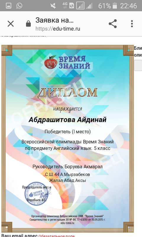 Окуучулар үчүн өткөрүлгөн “Время знаний” Бүткүл россиялык олимпиадасына катышкан окуучулар айрыкча, англис тили, математика, география, биология предметтери боюнча байгелүү орундарга жетишкен.