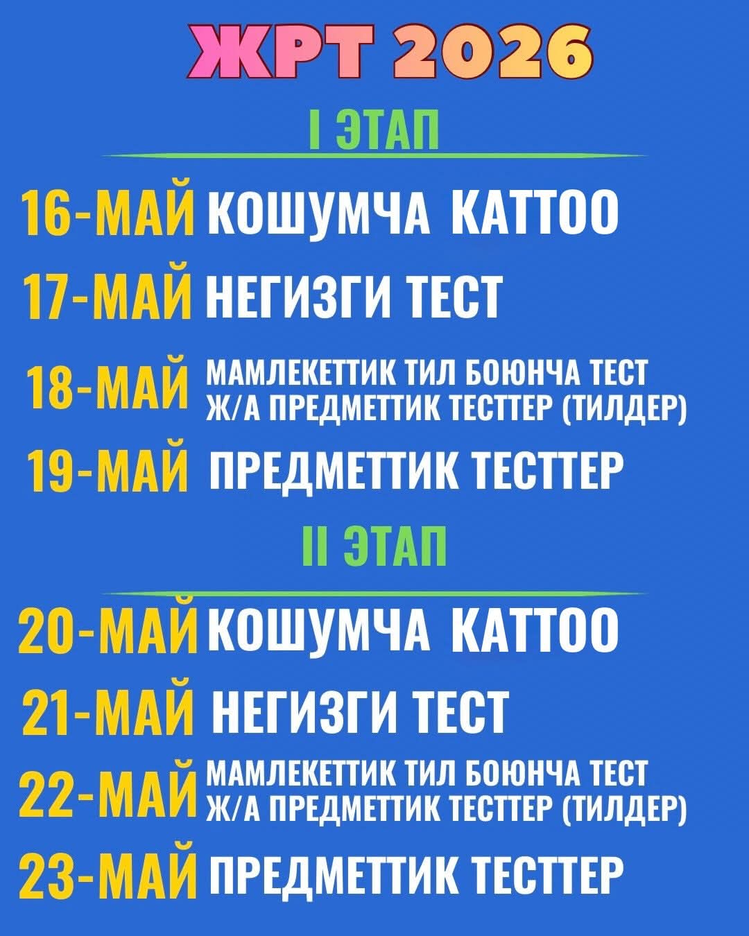 2026-жылы Жалпы республикалык тестирлөө (ЖРТ) 17-майдан 23-майга чейин өткөрүлөт.