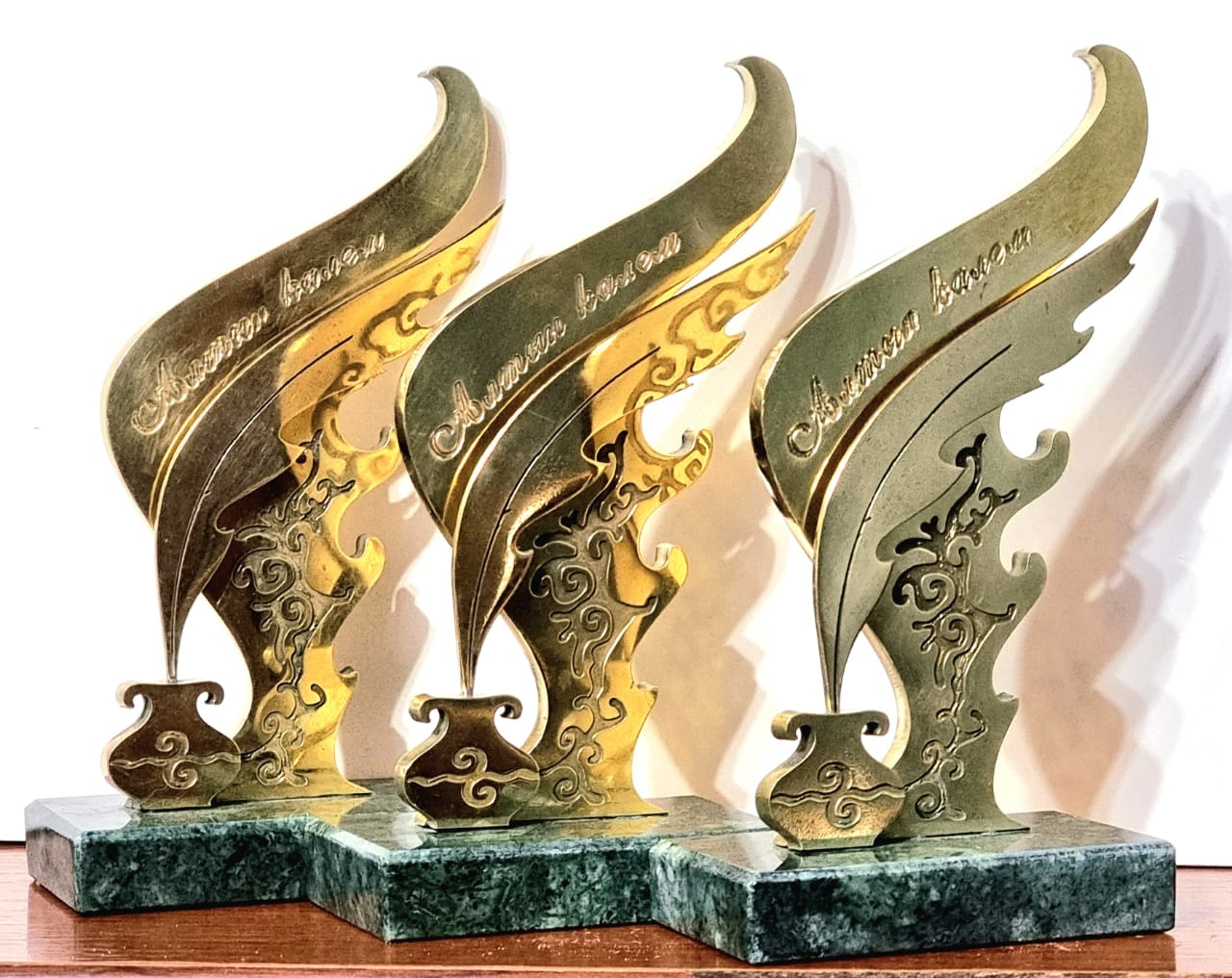 Улуттук жазуучулар бирлигинин жетекчиси Н.Калыбеков “Алтын калем” адабий сыйлыгынын жыйынтыгын жарыялап, поэзия, проза, драма жанры боюнча жеңүүчүлөр “Алтын калем” статуэткасы, диплом жана сертификат менен сыйланды.