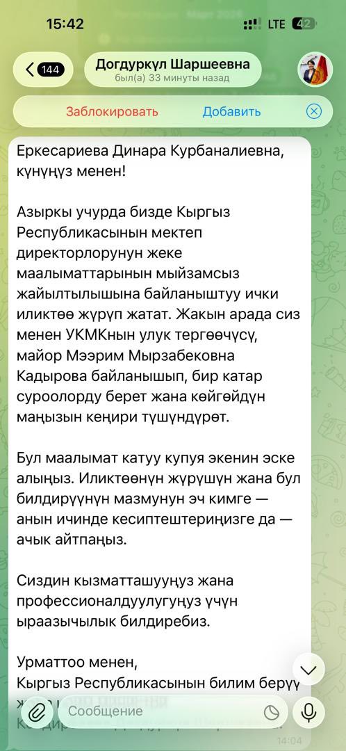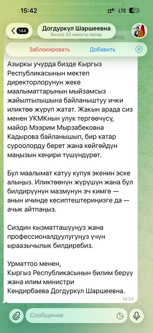 Кыргыз Республикасынын Агартуу министрлиги акыркы күндөрү Telegram мессенжери аркылуу министр Догдуркул Кендирбаеванын атынан жалган билдирүүлөр таралып жатканын маалымдады.