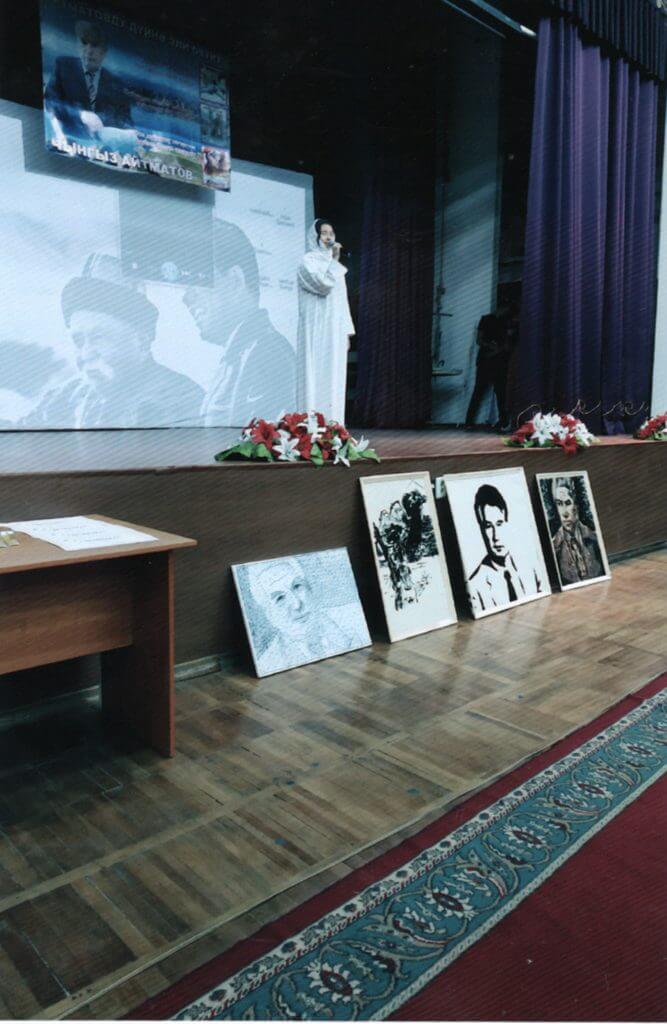 Н.Исанов атындагы КМКТАУнун колледжиндеги Ч.Айтматовдун 90 жылдык мааракесине арналган кечеде студенттер жазуучунун сүрөттөрүн кыл калем эле эмес, мык, жип жана жүн менен да жасашып, көргөзмөгө тартуулашты.