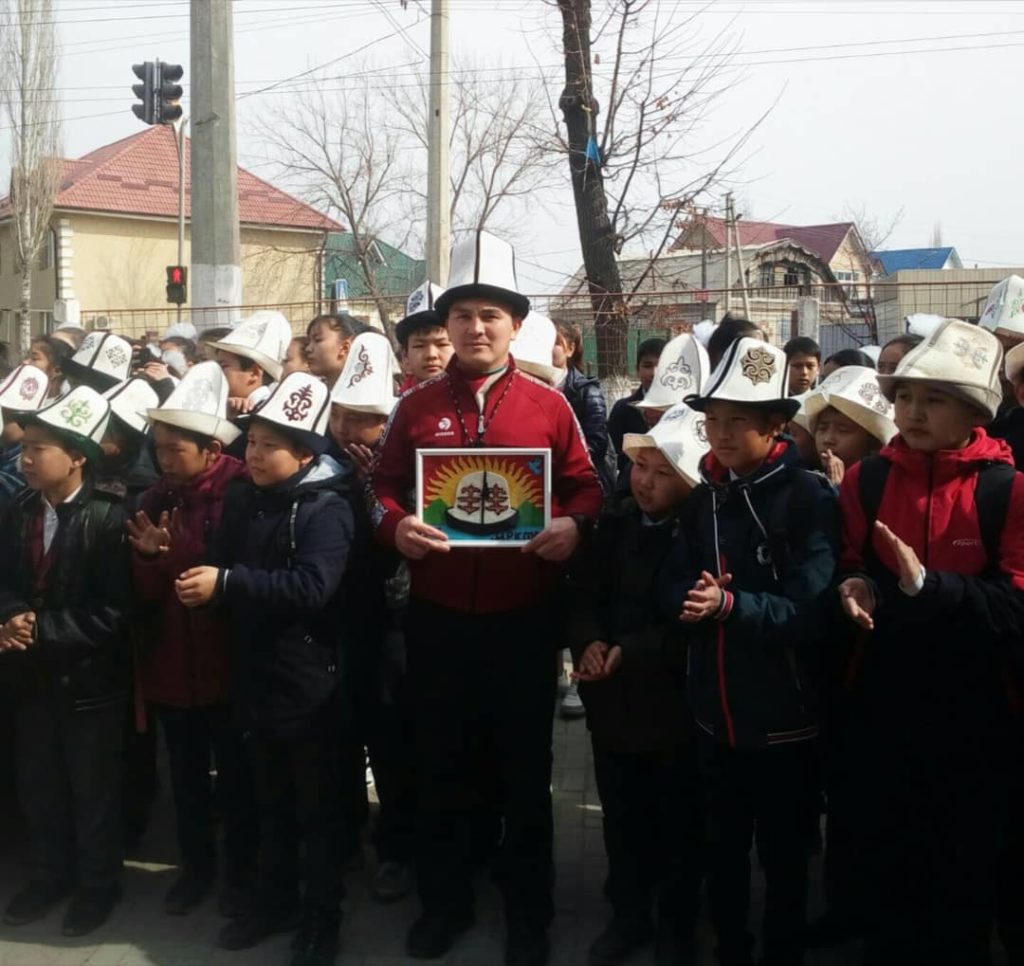 — Балдар, кечээ эле мамлекеттик Туу күнүн белгиледик. Бүгүн болсо, баарыңар ак калпак кийип келипсиңер. Ак калпак баарыңарга жарашып турат. Азаматсыңар, ушул багытыңардан тайбагыла! Манастын урпагы болобуз, мекенчилдигиңерден жазбагыла! – деди мектеп директору Аида Арипбековна.