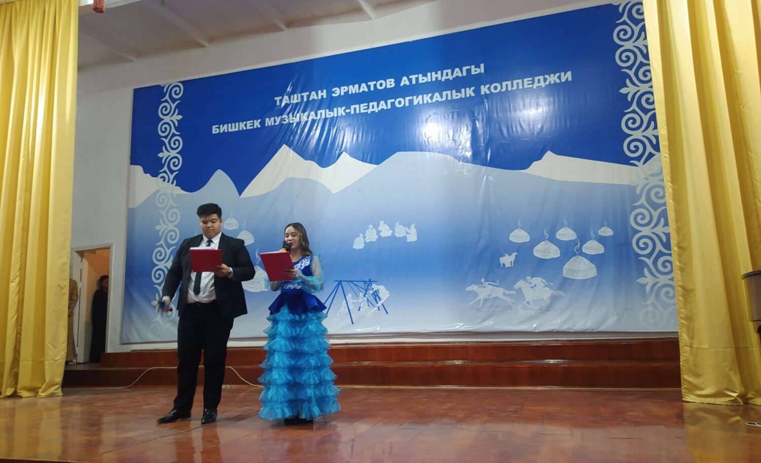 Студент жаштар биринен бири калышпай «кыргыз поэзиясынын туу чокусу», «бир ыры экинчисине окшошпогон», улуу Алыкулдун сөзү менен айтканда, акындык таланты «Шырдакбектин жоргосундай бар» чебер лирик, драматург, котормочу, журналист, биринчи кыргыз сценаристи, улуу Токтогулдун мурасын изилдөөгө өмүрүнүн төрт жылын арнаган таланттуу акын Жоомарт Бөкөнбаевдин ырларынан, поэмаларынан, тамсилдеринен үзүндүлөрдү көркөм окуп жатышты. Көркөм окуп гана тим болушпастан, бир канчасын, атай кетсек, «Жылан менен бака» тамсилин, «Чептен эрдин күчү бек» поэмасын сахналаштырып да беришти.