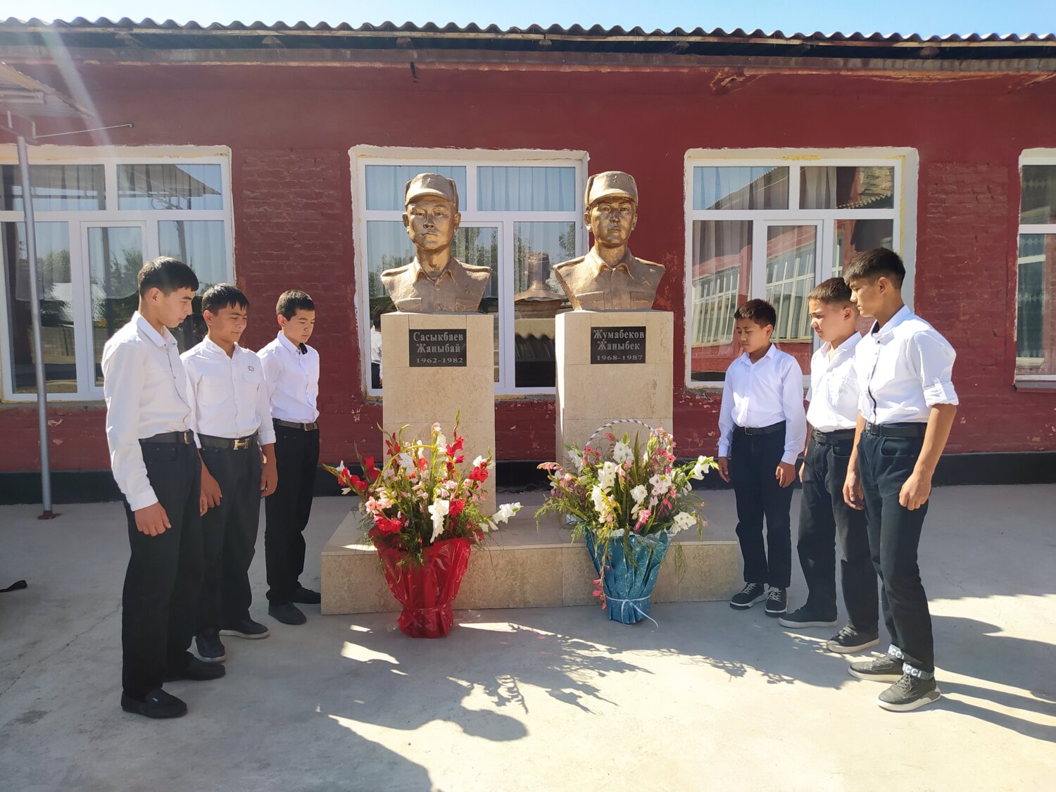 Бул күнү мектептин мурунку бүтүрүүчүлөрү, Ооган согушунун баатырлары Сасыкбаев Жаңыбай менен Жумабеков Жаныбектин эстелиги ачылып, гүлчамбарлар коюлду.