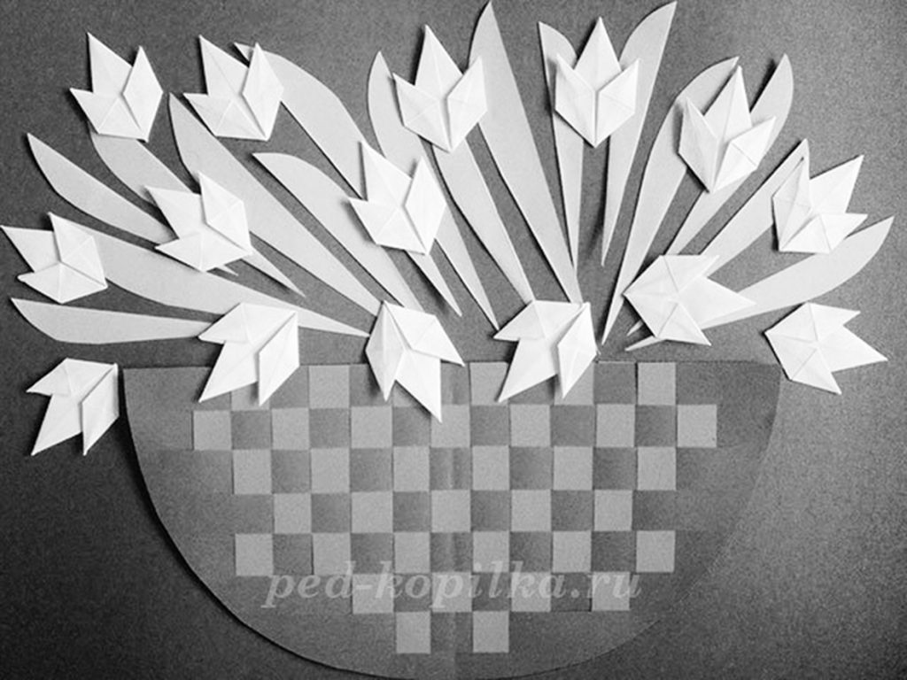 Чийген боюнча кесип алышат. Белгиленген жерин чаптап, байчечекейдин таажысын жаратышат. 3. Сабагын жашыл түстөгү барактын тилкелеринен түтүкчө кылып ороп чапташат, түтүктүн бир башы дискке жайгашкыдай, бир башы гүл таажысы отургудай кылып тилип, кесишет. 4. Гүлдүн таажысын сабакка отургузуп чапташат. 5. жашыл баракты экиге, төрткө бүктөп жалбырактарын кесишет. 6. Жалбырактарды сабагына тууралап чапташат. 7. Даяр болгон гүлдү өсүп келе жаткан элес берип, дисктин бетине отургузуп чапташат.