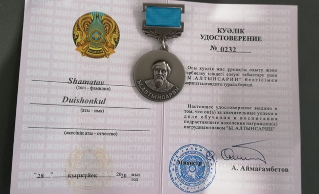 Жаӊы жыл алдында баарыбызды кубанткан кабар кошуна Казакстандан келди. Назарбаев университетинин профессору Дүйшөн Шаматов казак элинин атактуу агартуучусу Ыбырайым Алтынсарин атындагы төш белги менен сыйланыптыр!