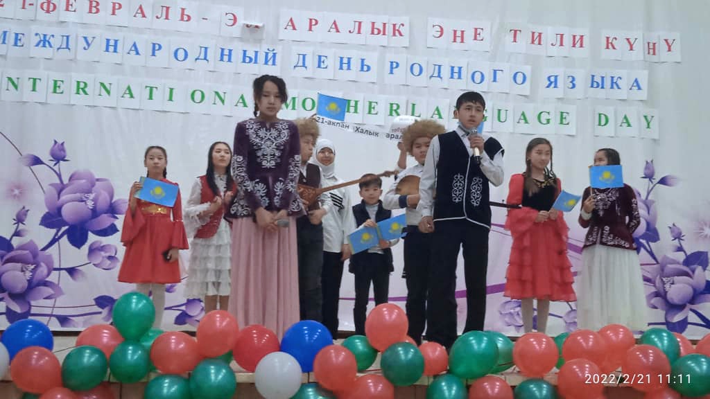 Эл аралык Эне тил күнүнө карата өткөрүлгөн бул иш-чараны мектептин кыргыз тили мугалимдери уюштурду. Тил майрамында ар бир класс өзүнө бөлүнгөн тилди ыр-күүгө салып даңазалашты.
