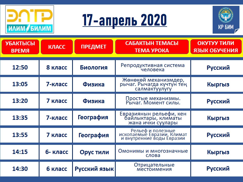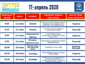 «ЭЛТРДИН» «БИЛИМ ЖАНА ИЛИМ» КАНАЛЫНАН 17-18-АПРЕЛЬ КҮНҮ БЕРИЛЧҮ ВИДЕОСАБАКТАРДЫН ЖАДЫБАЛЫ ӨЗГӨРДҮ 16.04.2020 0 БөлүшүүКомментарийлер