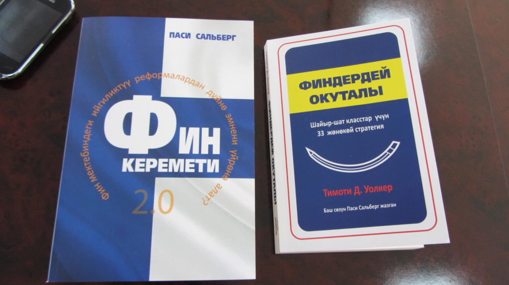 И.Арабаев атындагы КМУнун илимий китепканасында Паси Сальбергдин «Фин керемети 2.0: Фин мектебиндеги ийгиликтүү реформалардан дүйнө эмнени үйрөнө алат?» (англисчеси “Finnish Lessons 2.0: What Can the World Learn from Educational Change in Finland?”) Тимоти Уолкердин “Финдердей окуталы” (“Teach Like Finland”) китебинин кыргызча котормолорунун презентациясы болду. Иш-чарага билим берүү тармагынын кызматкерлери жана коомдук ишмерлер катышты.