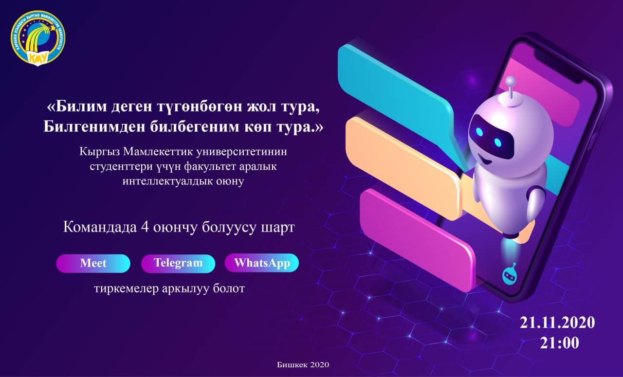 И.Арабаев атындагы Кыргыз мамлекеттик университетинин студенттери арасында «Билим деген түгөнбөгөн жол тура, Билгенимден билбегеним көп тура» аттуу онлайн интеллектуалдык оюну өткөрүлдү.
