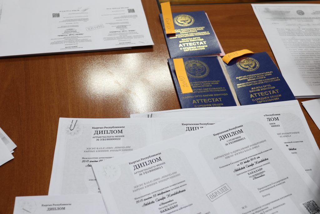 Мамлекеттик үлгүдөгү документтерде жаралып жаткан көйгөйлөрдү болтурбоо үчүн 20 адамдан турган ведомстволор аралык комиссия түзүлдү. Ага жогорку окуу жайлардын, Кыргыз улуттук илимдер академиясынын жана Билим берүү жана илим министрлигинин өкүлдөрү кирген.