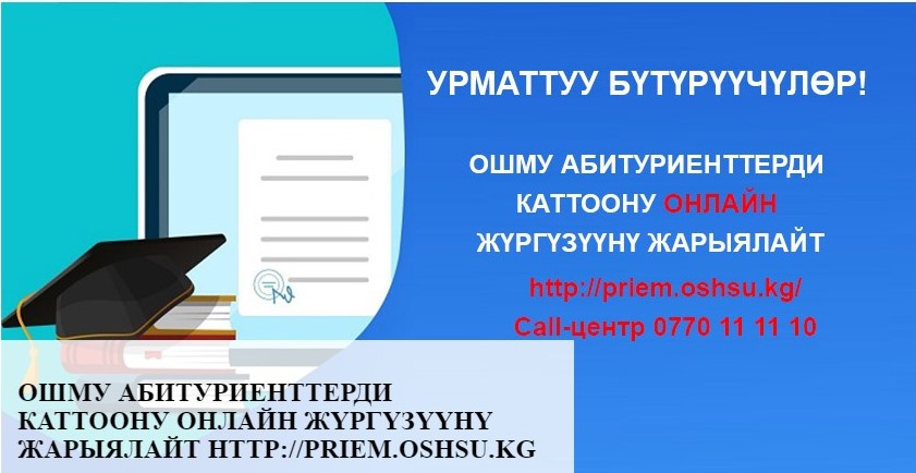 Ош мамлекеттик университетинде 2020-2021-окуу жылына абитуриенттерди кабыл алуу Билим берүү жана илим министрлиги тарабынан иштелип чыккан https://2020.edu.gov.kg системасы аркылуу онлайн форматта ишке ашырылууда.