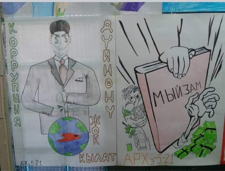 “Коррупция” темасы боюнча студенттер арасында плакаттардын көргөзмө-сынагында I орунду АРХэ-5-21 тайпасы, II орунду ХПК-2-21 тайпасы, III орунду БИС-1-21 тайпасы жеңишке жетишти.