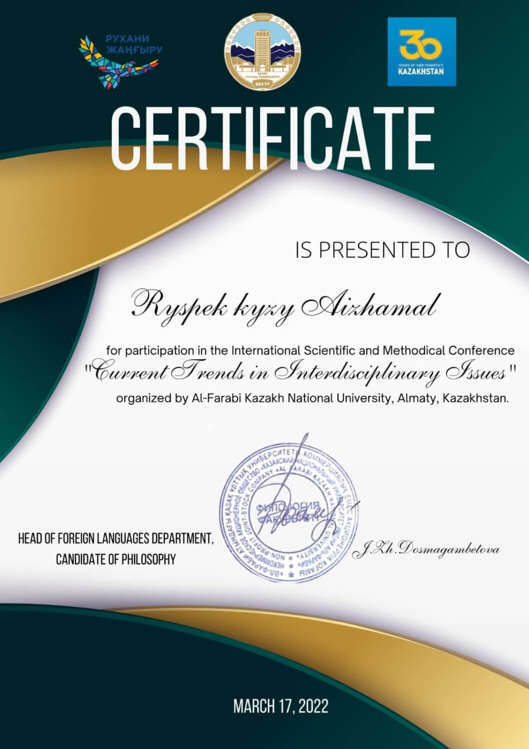 И.Арабаев атындагы КМУнун магистранты Рыспек кызы Айжамал Казакстандын Алмата шаарында Аль-Фараби университети тарабынан магистранттар үчүн уюштурулган “Current Trends in Interdisciplinary Issues” (“Aктуальные тренды междисциплинарных проблем”) аттуу илимий-практикалык конференцияга “Особенности научно-популярных текстов” деген аталыштагы англис тилинде баяндама жасап, сертификатка ээ болду.