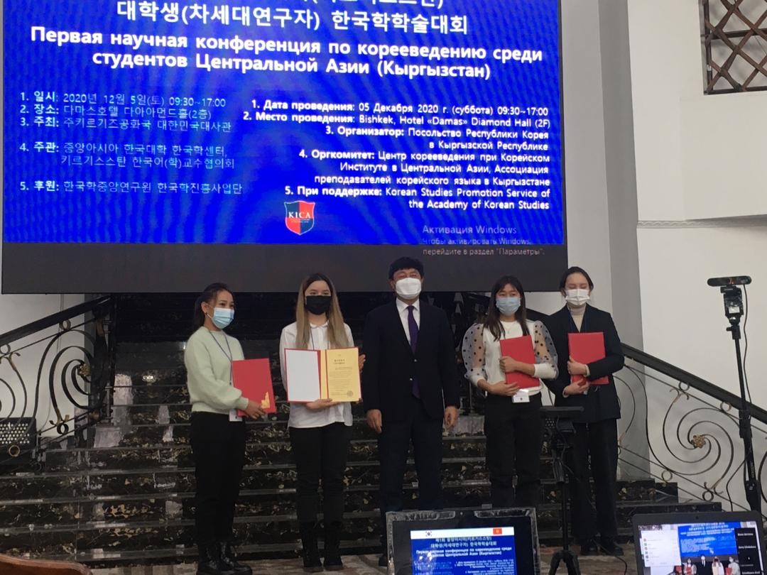 Корей таануу боюнча өтүп жаткан алгачкы студенттик илимий конференция Кыргызстандагы Кореянын элчилигинин колдоосу менен өттү. Ага Кыргыз улуттук университетинин, Бишкек мамлекеттик университетинин, Борбордук Азиядагы Корей институтунун, Кыргыз-Орус Славян университетинин, Дипломатиялык академиянын, Ош мамлекеттик университетинин студенттери, о.э. онлайн форматта Ташкент мамлекеттик педагогикалык университетинин, Аблай хан атындагы Казак эл аралык университетинин студенттеринен куралган топтор илимий баяндамаларды окушту. Жыйынтыгында, мыкты баяндама менен катышкандыгы үчүн топту жетектеп барган илимий жетекчилерге Кореянын элчилигинин атынан Ыраазычылык баракчалары, илимий баяндама жасаган студенттерден куралган ар бир топко акчалай сыйлык жана Ыраазычылык баракчалары тапшырылды.