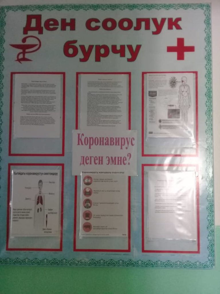 М.Элебаев атындагы мектептин 4-“в”-классынын мугалими Айнура Ашированын айтымында, мектептеги ден соолук бурчуна профилактикалык иштерди кандайча өткөрүү керек, гигиенаны кантип сактоо керек ж.б. темаларда класстык бурчтар уюштурулуп, балдардын күчү менен дубал газеталар даярдалган.