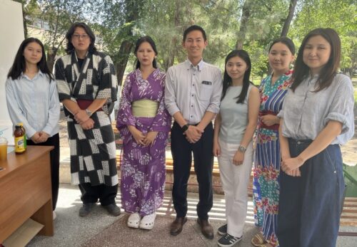 Бизде жапон маданиятын, каада-салттарын, оюн-зоокторун жана кийимдерин тааныштыра турган шарттар, мүмкүнчүлуктөр бар. Жапонияда биздин өнөктөштөр, биз иштешип жаткан компаниялардын өкүлдөрү бизге Зум аркылуу Жапония жөнүндө онлайн сабактарды өткөрүп турат. Тарыхы кандай, эмнени майрамдашат, кандай тамактанып, кандай окушат, кантип убакыт өткөрүп, эмнени колдоноорун бизге айына бир жолу лекция өтүп беришет. Жана ошондой эле бизге Жапониянын компанияларынан ар кандай өнөктөштөр, ар түрдүү адистиктер бизге көп келет, келген учурда биздин студенттер менен сүйлөшүп, баарлашып, суроо- жооп кылып, сабактарды өтүп турушат. Анан да ыктыярчыларды чакырып, жапон тилинен берген окутуучуларды көбөйтүү боюнча максаттарыбыз чоң. Ыктыярчылар боюнча биз керектүү документтердин баарын бергенбиз, азыр жообун күтүп жатабыз.