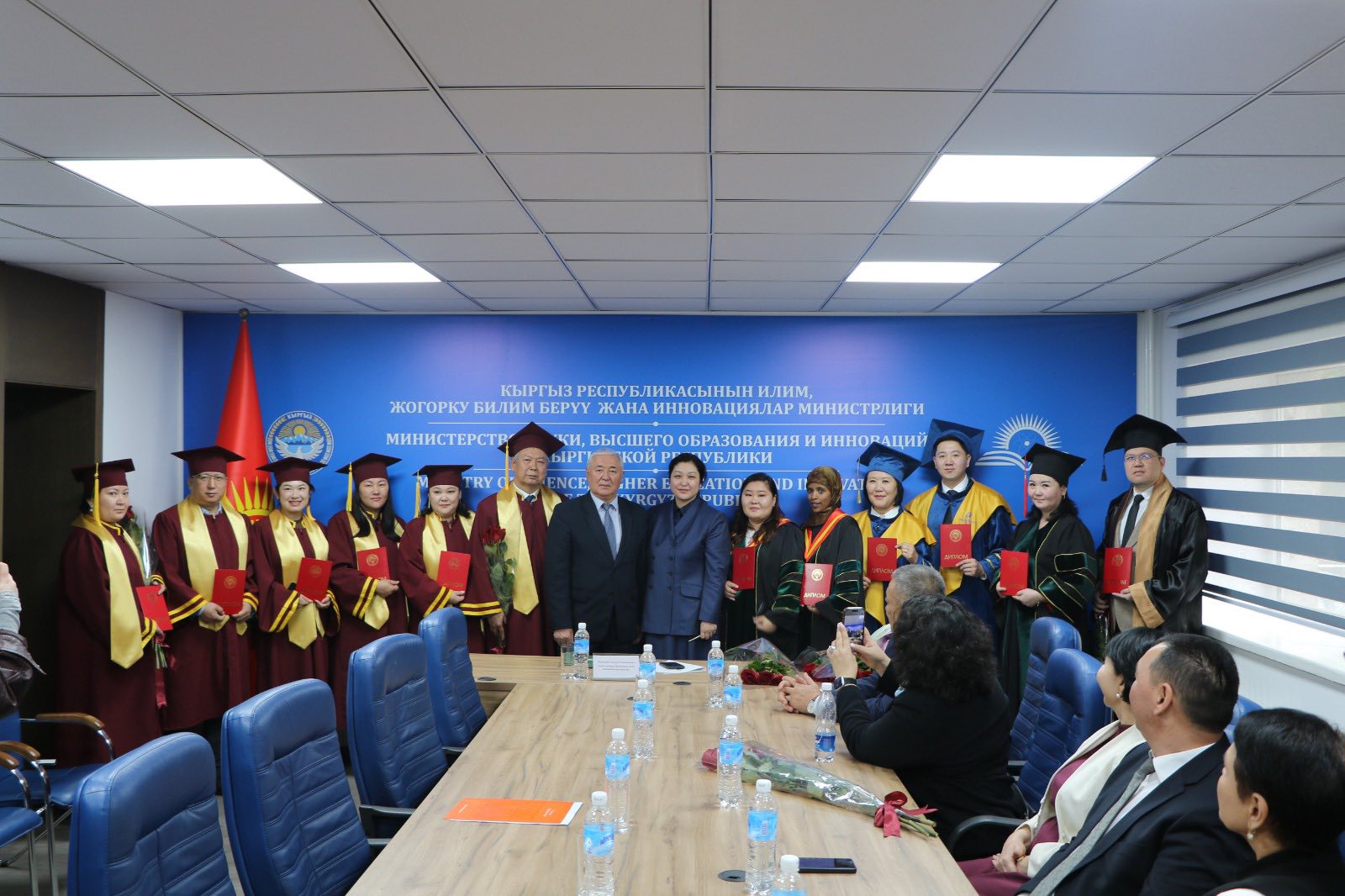 Иш-чаранын алкагында министр тарабынан мамлекеттик үлгүдөгү алгачкы 12 PhD дипломдору тапшырылды.
