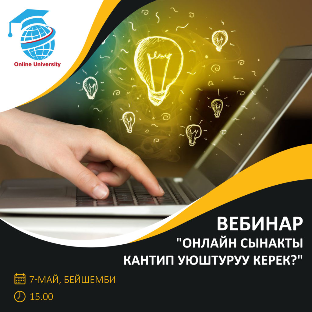 Онлайн университети 7-май күнү саат 15:00до учурда күн тартибинде турган «Онлайн сынакты кантип уюштуруу керек?» аттуу темада вебинарын өткөрөт. Бул вебинарга эл аралык билим берүү тармагында иштеп жаткан адистер жана педагогдор катышат. Алар онлайн сынак алуу эрежелери, онлайн сынак түрлөрү, онлайн сынакты уюштуруу сыяктуу маселелер боюнча кенен маалымат беришет.