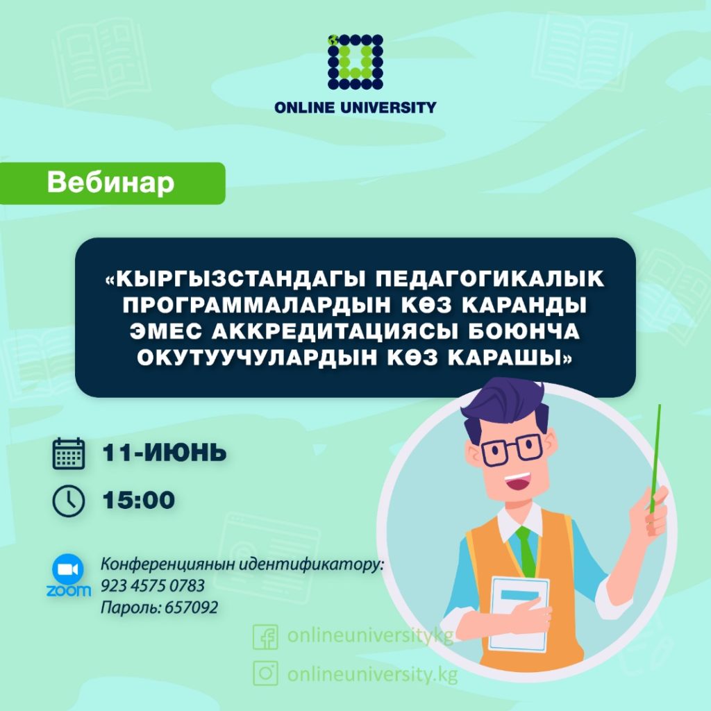 Онлайн Университеттин Педагогика лабораториясы 11-июнда саат 15.00дө «Кыргызстандагы педагогикалык программалардын көз каранды эмес аккредитациясы боюнча окутуучулардын көз карашы» аттуу вебинар өткөрөт.