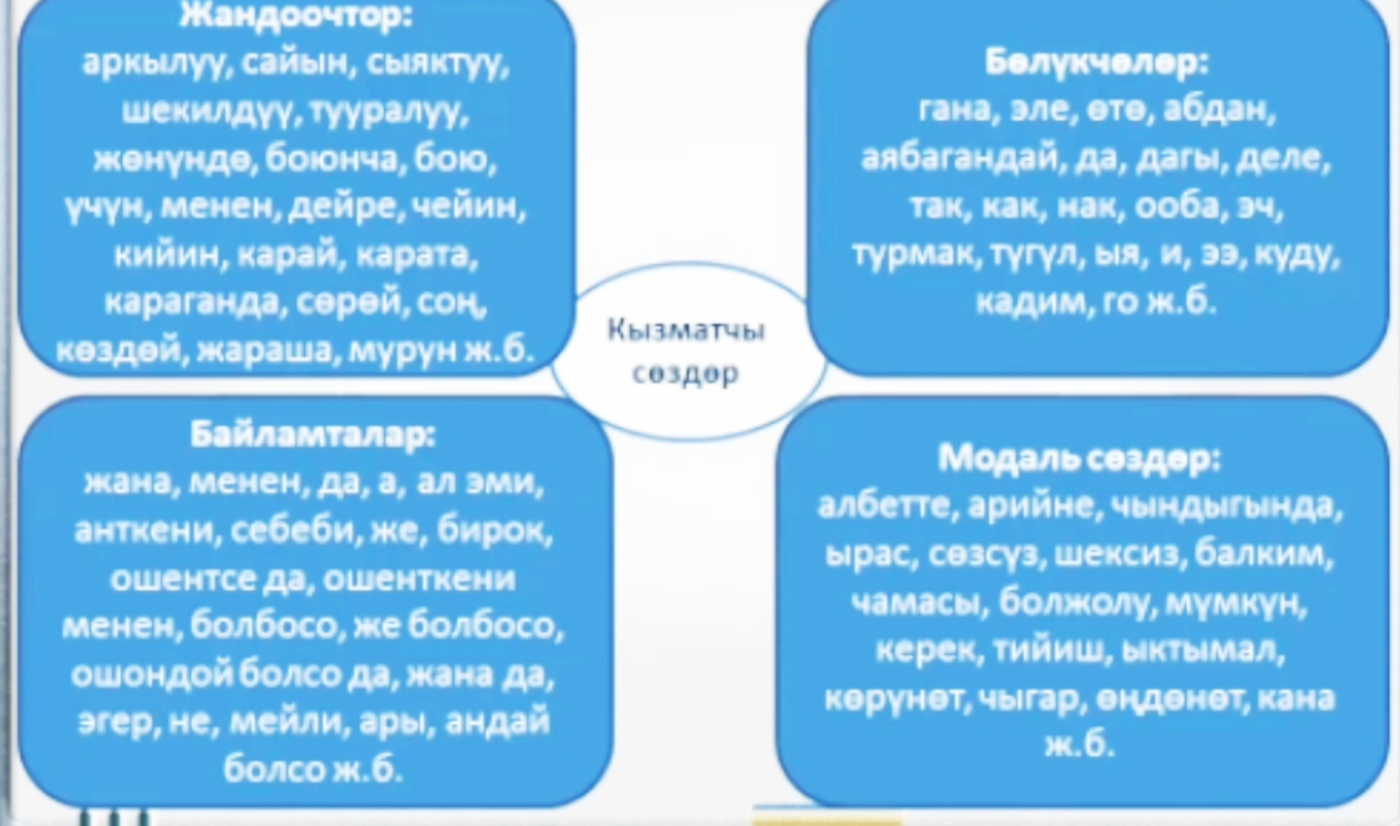 Андан кийин таасын мисалдар аркылуу кызматчы сөздөрдүн курамындагы жандоочко, байламтага, бөлүкчөгө жана модалдык сөздөргө кайсы сөздөр таандык экенин көрсөтөт.