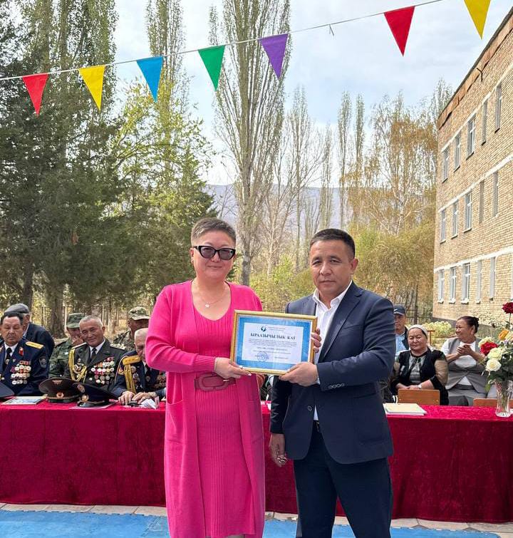 «Мекенди коргоочулар» коомдук бирикмесинин мүчөсү, запастагы капитан Гулзина Акматова демилгечи болуп, Россотрудничество уюмунун өкүлдөрү менен бирге келип мектепке жалпы суммасы жети миң долларга барабар 844 китеп тапшырышты.
