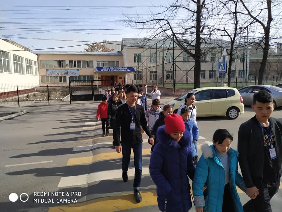 Студенттер жана волонтерлор мектеп окуучуларына жолдо жүрүү жана жолду кесип өтүү эрежелери тууралуу айтып беришип, балдарга үйүнөн баштап мектепке чейинки муршрутту түзүүгө жардам беришти.