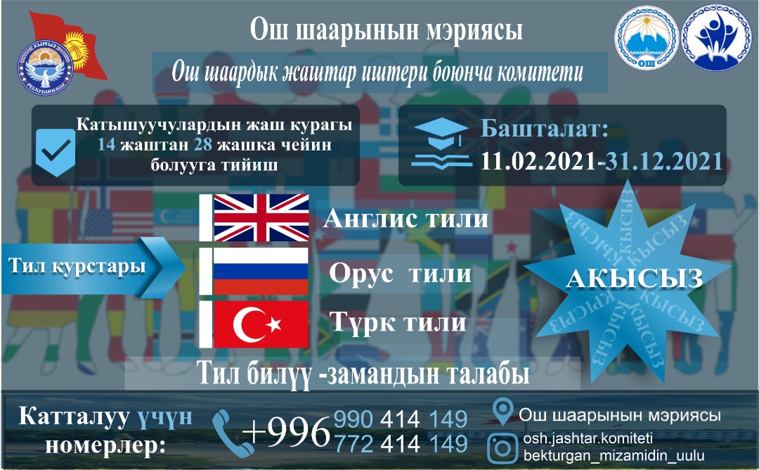 Ош шаарынын мэриясынын Ош шаардык жаштар иштери боюнча комитети жаштарга тил үйрөтүү максатында орус, англис, түрк тилдери боюнча акысыз курстарды уюштурууда.
