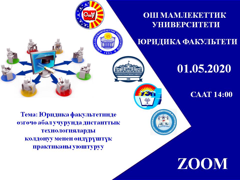 | 21. | Юридика факультети | “Юридика факультетинде өзгөчө абал учурунда дистанттык технологияларды колдонуу менен өндүрүштүк практикаларды уюштуруу” | -К.Ш.Токтомаматов атындагы Эл аралык университети, Баткен мамлекеттик университети, Жалал –Абаддагы Эл аралык университет, Жалал-Абад мамлекеттик университети -Факультеттин окутуучулар жамааты, студенттер, магистранттар, ЖОЖдордун каалоочу окутуучулары, студенттери, магистранттары | 1-май, 14-00 | |