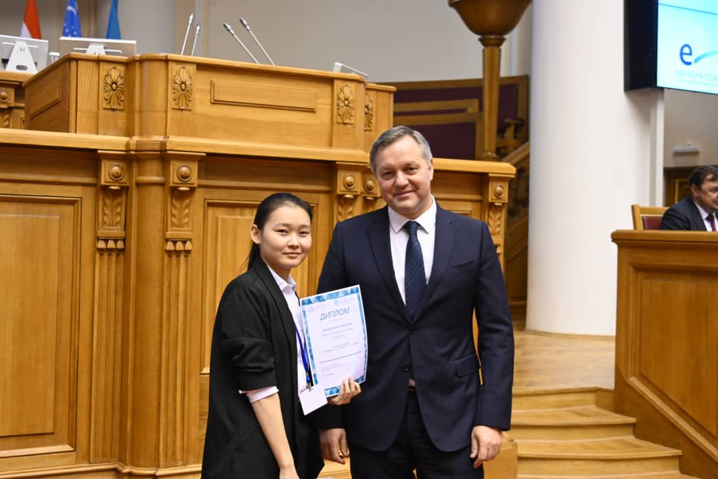 ОшМУнун Эл аралык билим берүү программаларынын жогорку мектебинин орус жана евразиялык интеграция бөлүмүнүн аймак таануу адистигинин 4-курсунун студенти Болот кызы Айгерим КМШ Парламенттер аралык ассамблеясынын штаб-квартирасында 29-ноябрдан 4-декабрга чейин өткөн студенттик дебаттардын жеңүүчүлөрүн сыйлоо аземине катышты.
