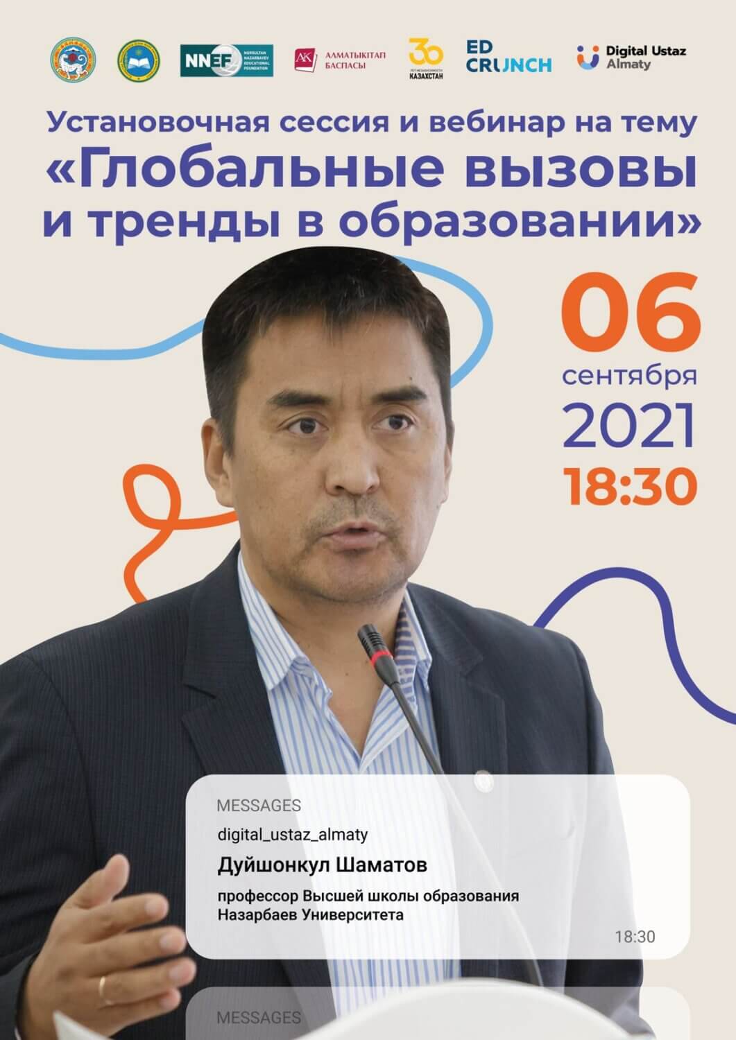 6-сентябрда Казакстандагы Назарбаев университетинин профессору Дүйшөн Шаматовдун «Глобалдык чакырыктар жана азыркы билим берүүнүн тренддери» аттуу вебинары болуп өттү.