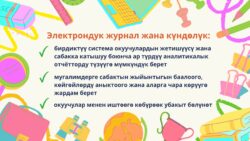 - Электрондук журналда мугалимдер сабакка катышуу жана баалоо сыяктуу маалыматтарды киргизип, аларды автоматтык түрдө электрондук күндөлүккө жиберип, окуучулар жана ата-энелер менен бөлүшө алат.