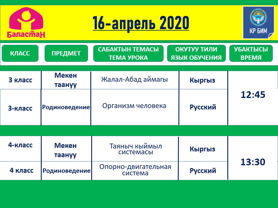 ТЕЛЕКАНАЛДАРДАН КЕТЧҮ ВИДЕОСАБАКТАРДЫН ЖАДЫБАЛЫ. 13-18-АПРЕЛЬ