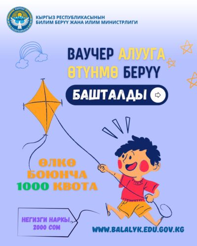 Агартуу министрлиги 2025-жылдын 3-июнунан тарта 1 жаштан 6 жашка чейинки балдар үчүн пилоттук режимде 1000 ваучер бөлүнүп, balalyk.edu.gov.kg порталы аркылуу электрондук өтүнмөлөрдү кабыл алуу башталганын маалымдайт.
