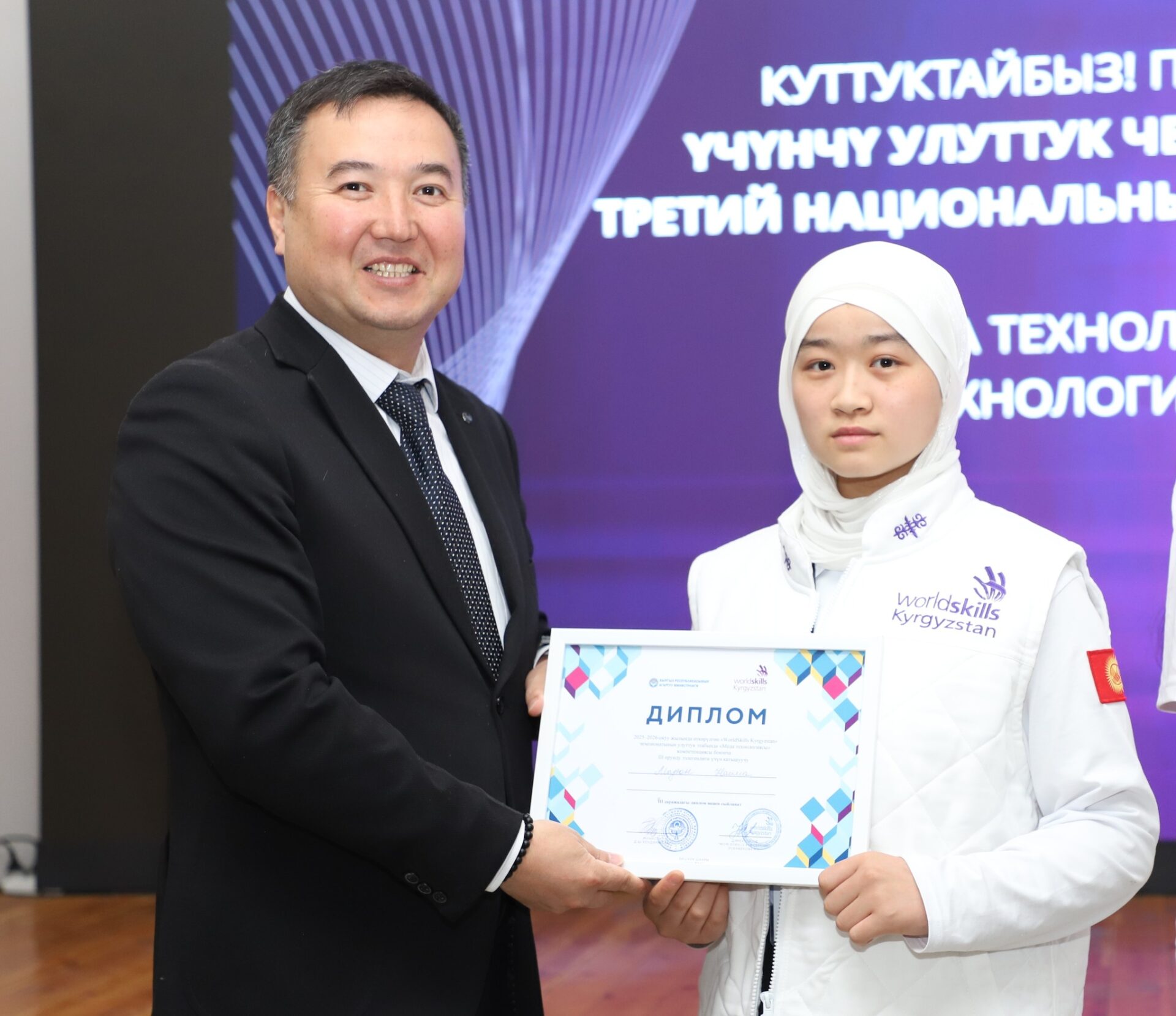 - Чемпионат жөн гана мелдеш эмес, бул Кыргызстанда кесиптик билим берүүнүн жаңы деңгээлге көтөрүлүшүнүн, заманбап талаптарга жооп берген кадрларды даярдоонун жана эмгек рыногунун талаптарына шайкеш келүүнүн айкын көрсөткүчү. Билимге жана инновацияга таянган туруктуу экономиканы калыптандыруу — биздин стратегиялык негизги максатыбыз. Ошондой эле илимий изилдөөлөрдүн жыйынтыктарын реалдуу секторго киргизүү аркылуу илим менен өндүрүштүн тыгыз байланышын чыңдоого басым жасайбыз. Мындан тышкары, инновациялык экосистеманы өнүктүрүү, жаңы идеяларды жана технологияларды колдоо аркылуу атаандаштыкка жөндөмдүү чөйрөнү түзүү — негизги багыттарыбыздын бири болуп саналат. Айрыкча жаш адистерди, стартаптарды жана демилгелүү жаштарды колдоого өзгөчө көңүл буруп, алардын потенциалын ачууга шарт түзүүгө умтулабыз. Ошону менен бирге эл аралык кызматташууну кеңейтүү аркылуу алдыңкы тажрыйбаларды тартуу, билим берүү жана илим тармагын дүйнөлүк деңгээлге интеграциялоо — биздин ишибиздин маанилүү бөлүгү болуп эсептелет, — деп билдирди.