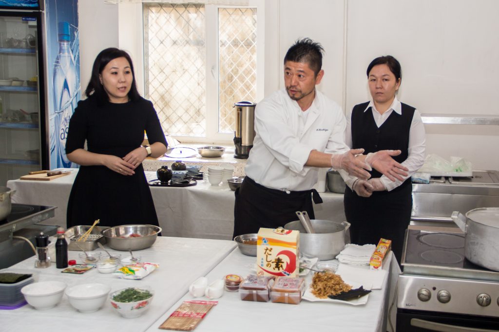 - Көп жылдан бери Япон Эл аралык кызматташуу агенттиги (JICA) менен сүйлөшүп, “бизде пиццериялар көп, япон тамак ашын биз туура даярдап жатабызбы же туура эмеспи, ашпозчу жөнөткүлө” деп сурангам. Кыргызстандагы Япония мамлекетинин элчиси Ёсихиро Ямамура өзүнүн ашпозчусун алып келип, мастер-класс өткөрттү. Элчи дагы, анын 2-катчысы дагы орус тилинде жакшы сүйлөшөт экен. Баарлашканга бизге абдан жеңил болду, — дейт директор айым.