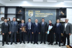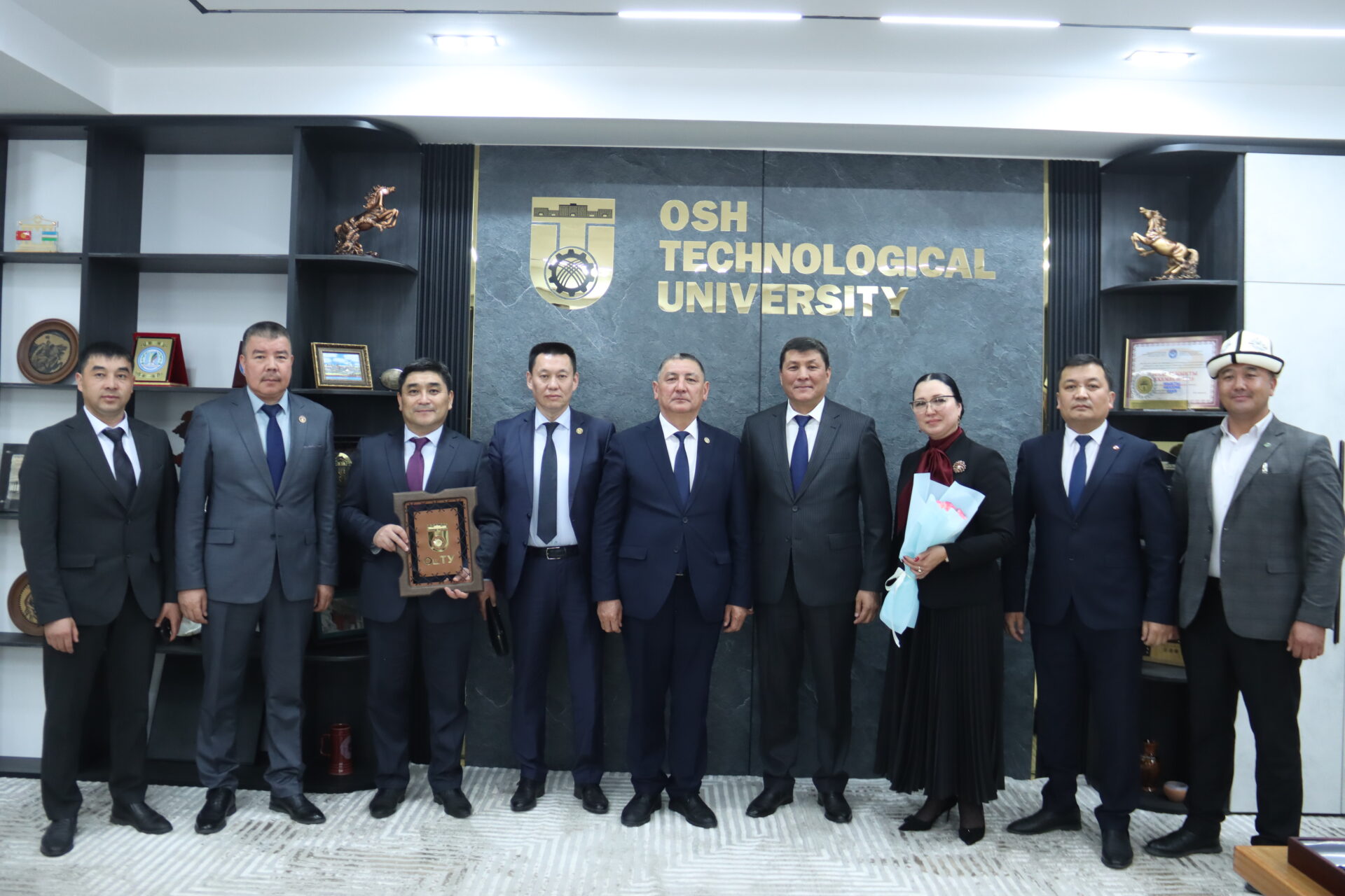 Делегацияны Ош технологиялык университетинин ректору, профессор Жанболот Турсунбаев жана проректорлор, институт директорлору, бөлүм башчылардан турган топ тосуп алды.