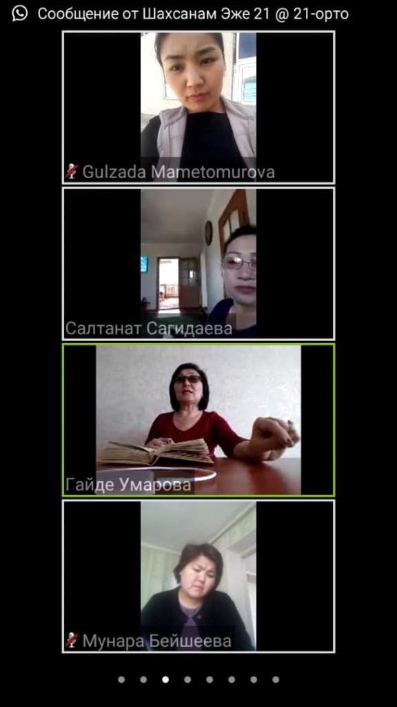 — Азыркы кырдаалга карата мугалимдер кезектеги каникул Билим берүү министрлиги бекиткен боюнча 3-чейрек 2020-жылдын 20-марты менен аяктамак. Ошол убакытта КТПга ылайк 3-чейректеги өтүлгөн окуу программаларына жалпы кайталоо жүрмөк. Биз ошол 16-20-мартта кайталануучу программаларды 23-27-март ичинде окуучуларга WhatsApp аркылуу тапшырмаларды берип, кайтарым байланышты түздүк. Ошол эле учурда министрликтин сайтына жайгаштырылган ЭлТР, САНАТ телеберүүлөрү аркылуу өтүлүүчү телесабактар ата-эне менен окуучулардын группасына жөнөтүлүп, алар көрүп, окушту. Ал эми 30-мартынан-3-апрелге чейин мугалимдер ар кандай онлайн сабактарды өтүүгө оңой жана жөнөкөйрөөк болгон программалар менен таанышып, аны кантип колдонууну үйрөнүштү. Сабактардын түрлөрүн даярдап, группаларга салып иштөө принциби менен да таанышып чыгышты. Мисалы, ZOOM, сократив, гугл классруум, мугалим ТВ группаларына киргизилген видеосабактар менен таанышып чыгышкан. 8-апрелден баштап окуучуларга билим берүү стандартынын дистанттык негизде окууга окуучулар менен ата-энелерди түшүндүрүү иштерин жүргүзүп бүттүк. Ушул аптада педкеңешти ZOOM программасы аркылуу өттүм, — дейт Г.Умарова.