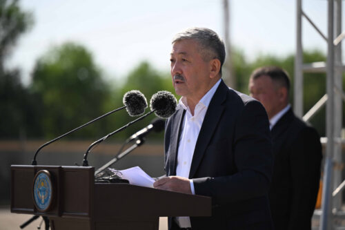 Председатель Кабинета Министров Кыргызской Республики — Руководитель Администрации Президента Адылбек Касымалиев в рамках рабочей поездки в Таласскую область принял участие в церемонии закладки капсулы под строительство школы в городе Талас.