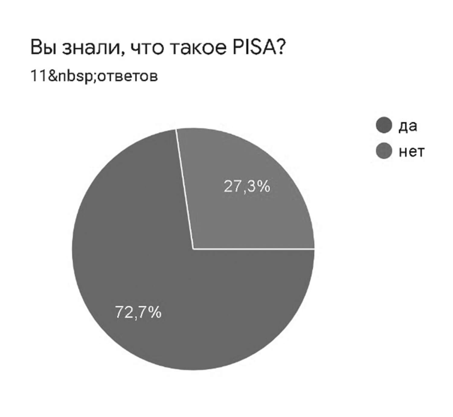 Из 26 участников 27% не знали, что такое PISA. Только 33 % респондентов знали, что является фокусом исследования PISA. Почти 40 % не знакомы с тестами исследования, 60% считают, что недостаточно учебно-методических рекомендаций и пособий по PISA.
