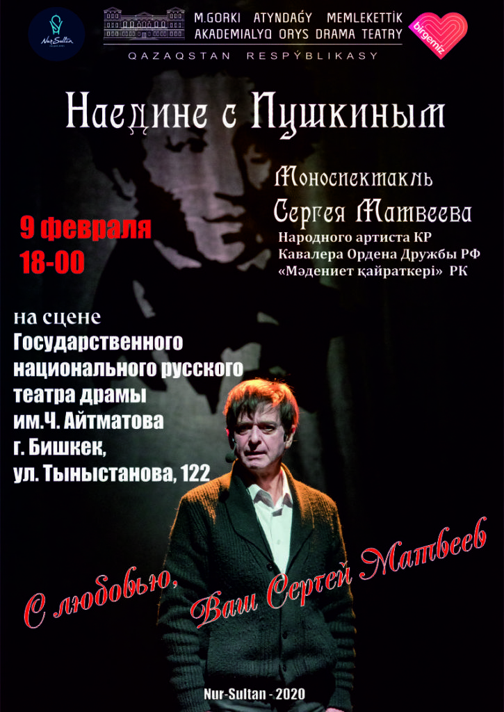 9 февраля 2020 г. в 18.00 на сцене Государственного национального русского театра драмы им. Ч. Айтматова состоится показ моноспектакля «Наедине с Пушкиным». Исполнитель главной роли и режиссер – актер Государственного академического русского театра драмы им. М. Горького (Нур-Султан, Казахстан), Народный артист Кыргызской Республики Сергей Матвеев. Показ спектакля пройдет при информационной поддержке представительства Россотрудничества в КР.