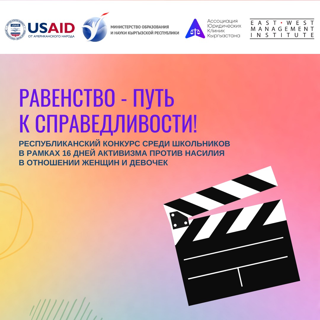 Приглашаем учениц и учеников 9-11 классов всех школ Кыргызстана к участию в республиканском конкурсе по предотвращению гендерного насилия «Равенство – путь к справедливости!», организованный Ассоциацией юридических клиник Кыргызстана в партнерстве с Министерством образования и науки Кыргызской Республики в рамках проекта USAID «Укук булагы».