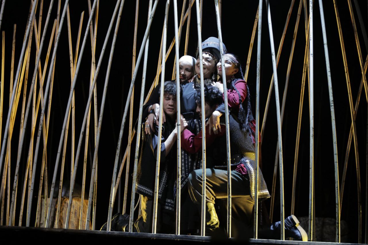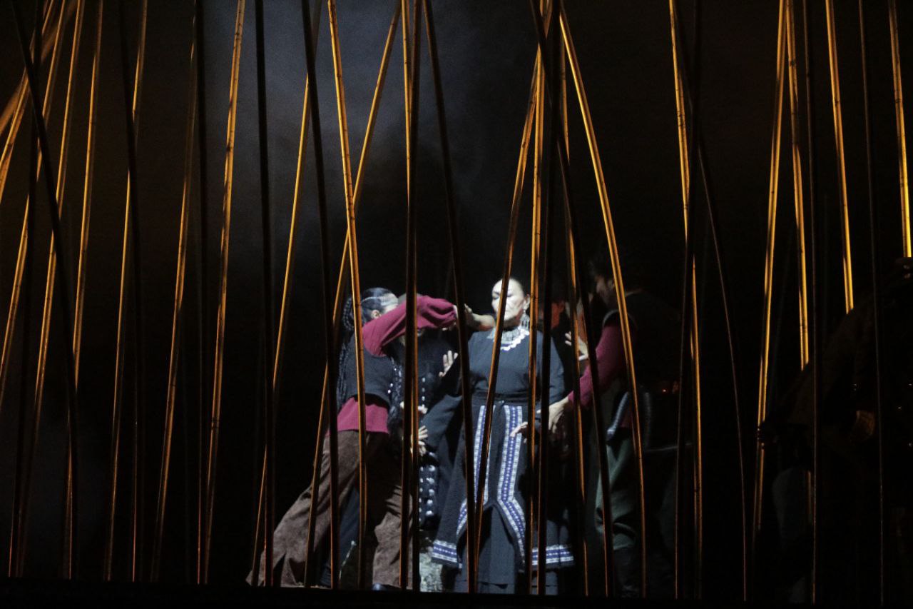С первого мгновения зрителя захватывает сценография Садыра Ниязакунова. Пространство сцены прочитывается одновременно как бескрайняя степь с камышами и как каркас юрты. Эти вертикали становятся символом двойственности: свободы природы и жёсткости уклада, зыбкости жизни и жесткости традиции. Свет проникает сквозь эти прутья, создавая ощущение тревожной нестабильности, будто сама сцена колеблется между светом и тенью. Декорация превращается в самостоятельный язык спектакля, в метафизическое пространство, где затмение происходит не только в небе, но и в душах.