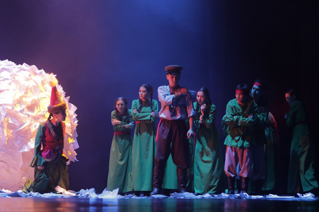 Спектакль «Макондо» стал одним из самых загадочных и визуально поэтичных представлений на фестивале. Постановка Жезказганского казахского музыкально-драматического театра имени С.Кожамкулова в интерпретации белорусского режиссёра Д.Филипповича — это не просто сценическая адаптация Габриэля Гарсиа Маркеса, а самостоятельное художественное высказывание, где слово, пластика, музыка и свет слились в одно целое. Спектакль «Макондо» представляет собой путешествие в миф времени и памяти.