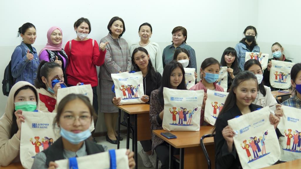 От имени проекта “Девочки в науке” МОФ “Инициатива Розы Отунбавой” участницы получили на память сувенирную продукцию (шоппер и флешку).