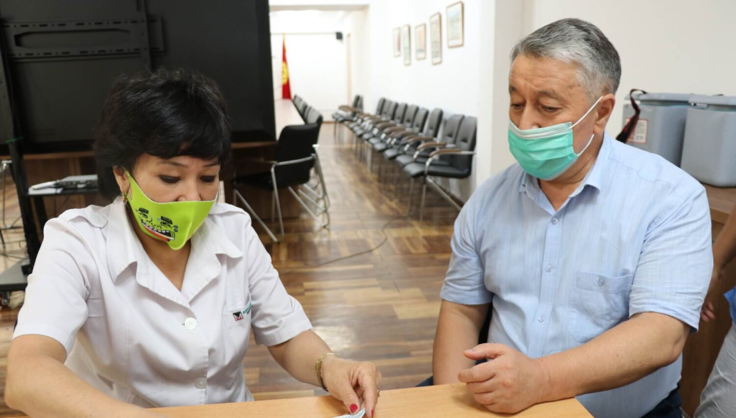 Сотрудники Министерства образования и науки продолжают получать вакцину против коронавируса. Сегодня в министерство прибыла мобильная группа поликлиники №1 города Бишкек. Руководство министерства первыми получили вакцину «Синофарм».